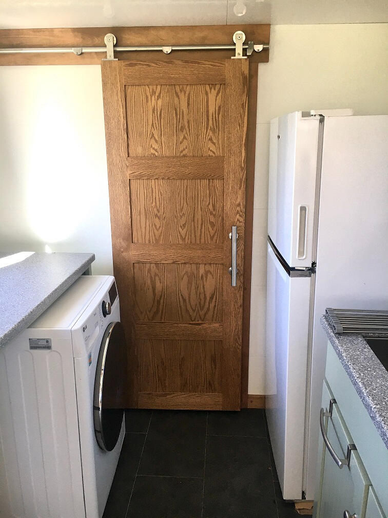 Interior siding: white PVC interlocking liner paneling with wood trim